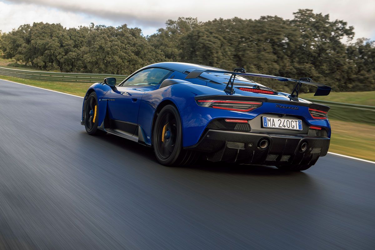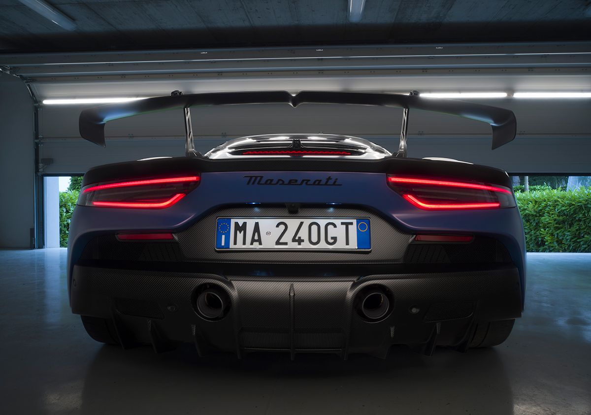 中央のMC20よりずっと大きく開いた口から入った空気は、フロント・トランクを潰して設えられた通気孔を通してカーボン製のフロント・フードのエア・アウトレットから排出されてダウンフォースを稼ぐ。さらに、両サイドのフェンダーにも両サイドから取り入れてブレーキを冷却するのに使った空気を排出するエア・アウトレットが備えられているが、いずれもレーシングカーとまったく同じデザインになっている。
