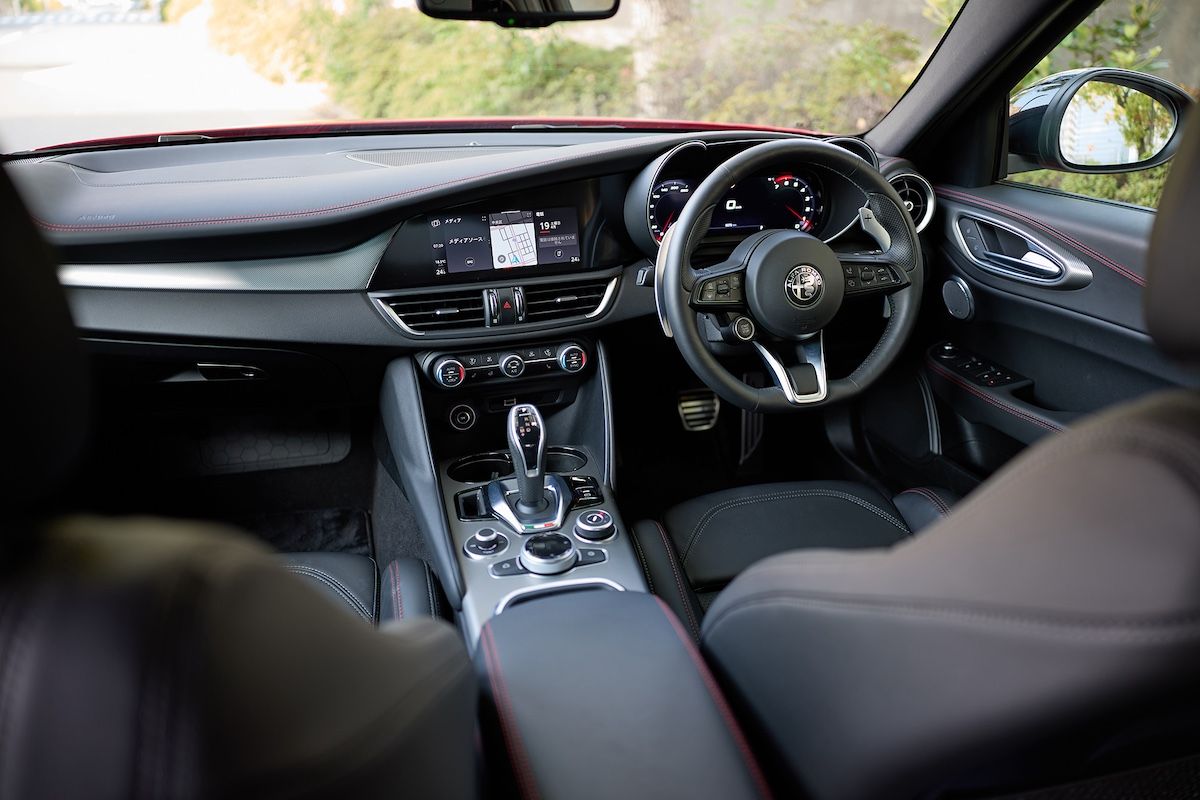 街中で普通に運転していても室内は静かでステアリングも軽く痛痒を感じるところはないはずだ。特筆すべきはその乗り心地の良さで、フラッグシップのクアドリフォリオが採用するアルファ・アクティブ・サスペンションを特別に装備したことで、しっとりとした良好な乗り心地とスイッチひとつで切り替わるスポーティな走りの両方が楽しめる。ホイールもクアドリフォリオと同じ19インチの大径サイズだが、ゴツゴツしたところのない当たりの柔らかさは驚くほどだった。
