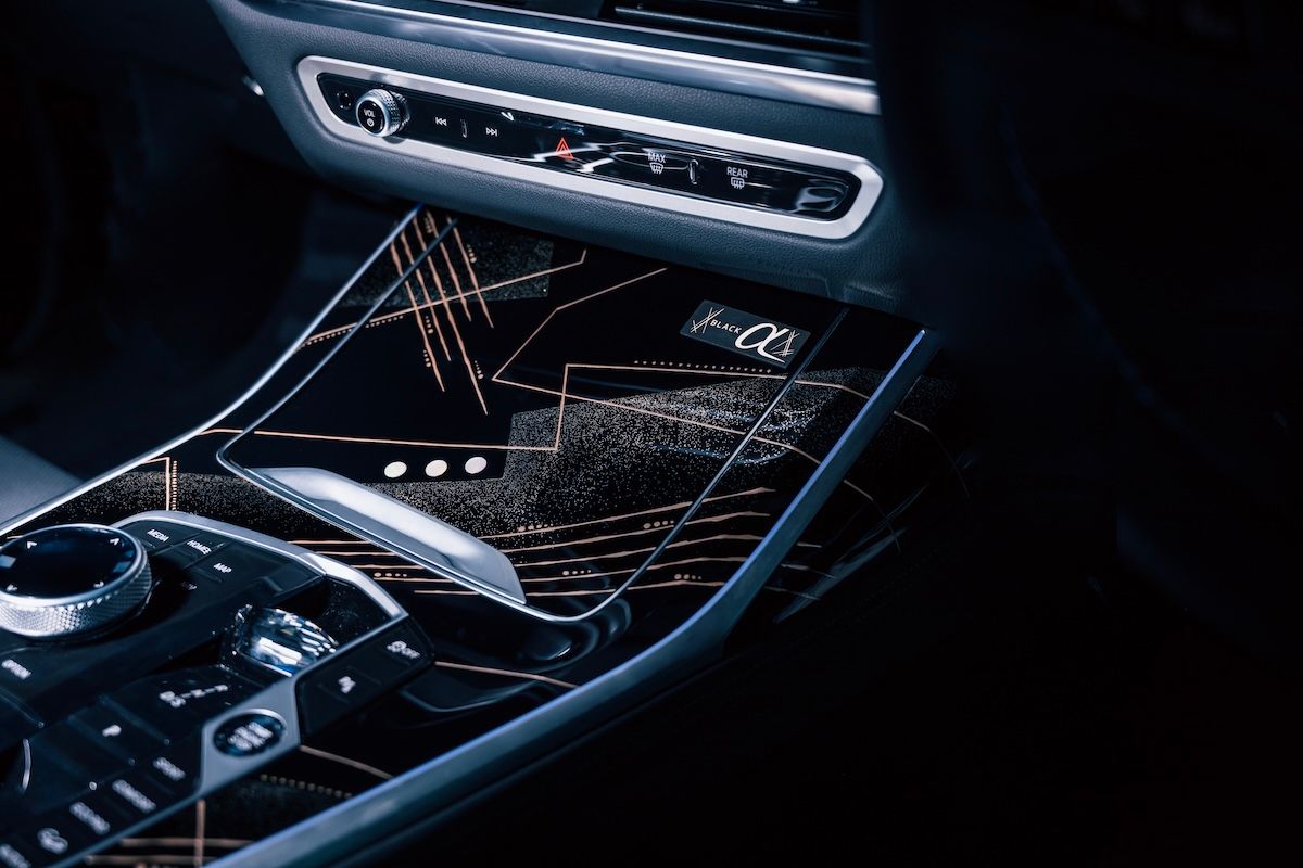 X7 M60i xDrive ブラック・アルファには、さらに特別な装飾が施される。服部氏による漆蒔絵と螺鈿の装飾トリムが、センター・コンソールやインストゥルメント・パネルまわりを彩る。そのモチーフは、”時つ風”と呼ばれる縁起の良い追い風。銀粉や白蝶貝の繊細なきらめきが、漆の奥行きとともに深みを生む。