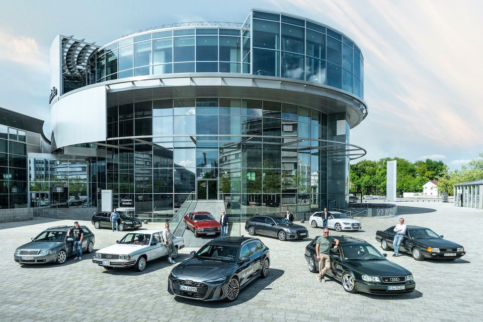 ドイツのアウディ・フォーラムの前に集まった、A6前身の100を含めた9世代のCシリーズとそのオーナーたち。