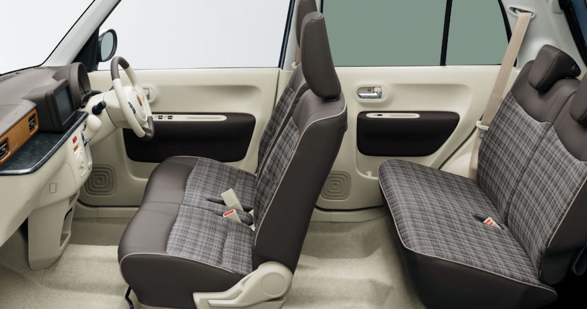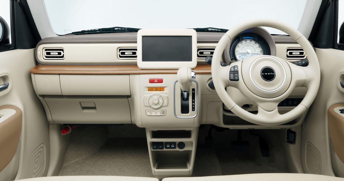 内装では、シート表皮やトリムの色調を変更。ラパンのハイブリッドXはインパネ・ガーニッシュをサンセット・アイボリー、インパネ・オーナメントをブラウン木目調とし、シート表皮とドアトリム・クロスは、外装色に合わせてライト・ブルーかモカ・ブラウンを設定する。