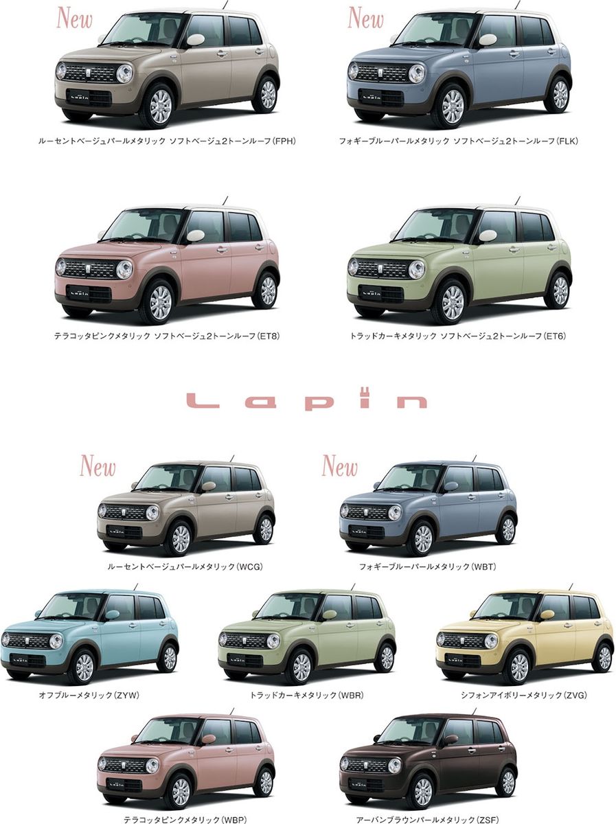 ボディ・カラーは、新色のルーセント・ベージュ・パールメタリックと、ワゴンRに設定されるフォギー・ブルー・パール・メタリックを導入。ラパンはモノトーン7色とデュオ・トーン・ルーフ4色、ラパンLCはモノトーンとデュオ・トーン・ルーフ各6色をラインナップする。
