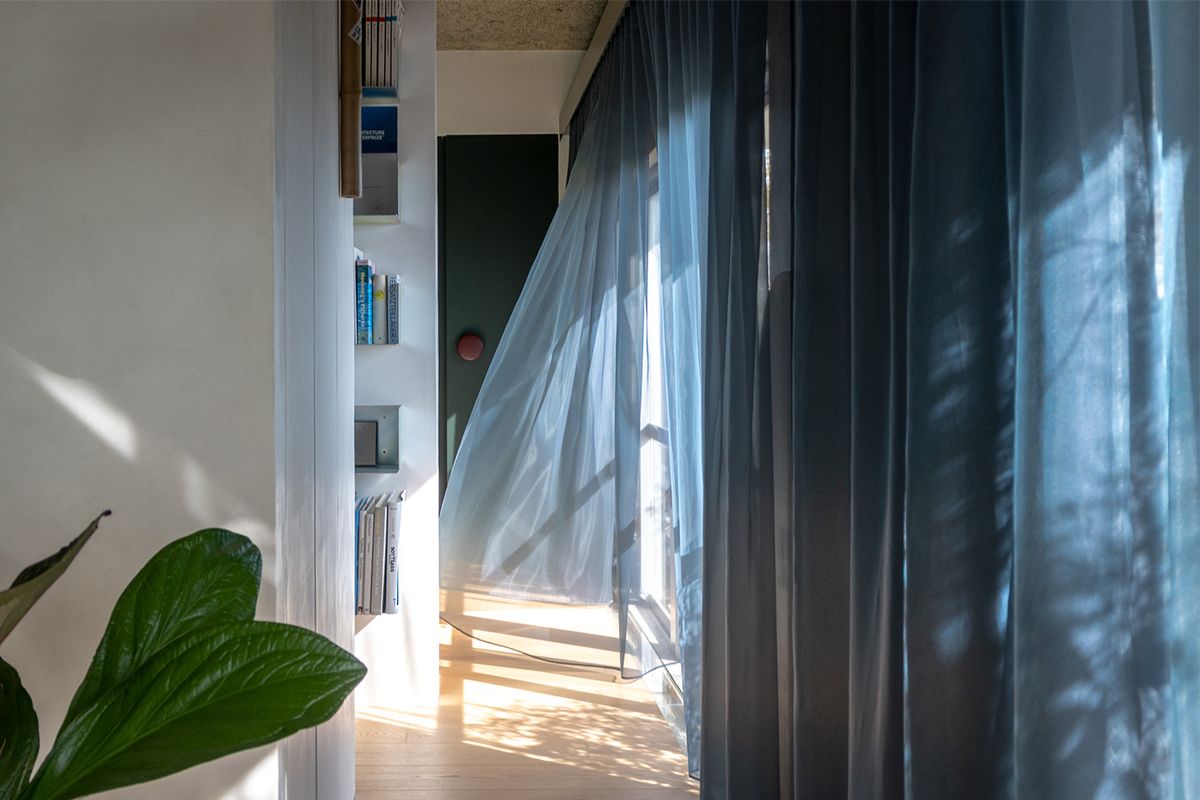 デザインにはこだわったが、仕上げ材には高価な素材は用いなかった。それどころか、天井やキッチンの壁は、仕上げを施さずむき出しのまま。バスルームの扉に貼ったファブリックは、余ったもので大テーブルのベンチのクッションを作成した。古いマンションなので、サッシは昔ながらのガラスが一重のもの。高いコストをかけて、あえて二重にしなかった。取材は風の強い日だったので、サッシの隙間から漏れる風が青いカーテンを揺らしていた。