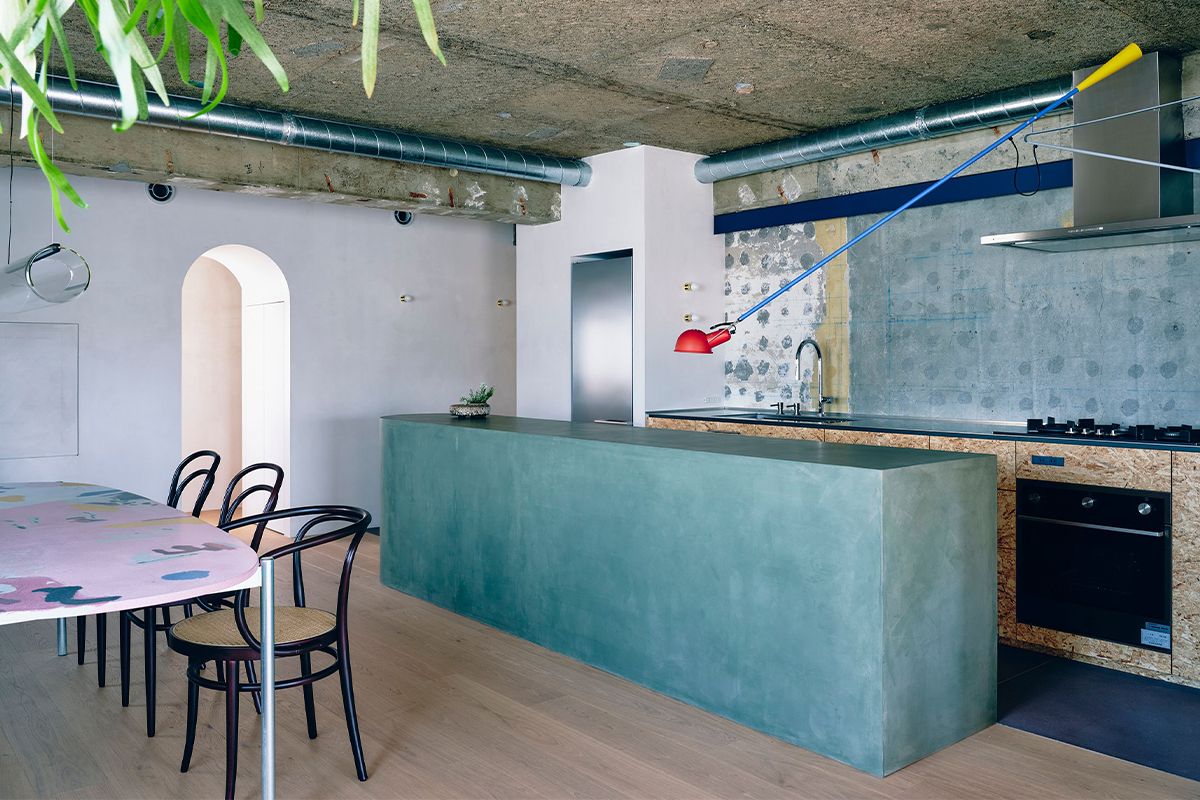 一方、自宅兼オフィスと考えると、ダイニング・キッチンのエリアは相当に広い。中富さんが料理好きのうえ、友達を招くことが多いのだとか。テーブルとともにインテリアで大きなポイントになっているのが、両端がカーブした幅4mの緑のカウンターだ。大きな食器類や家電などが、この中に納められている。また来客時は、彼らが持ってきた手土産を並べたり、バーカウンターになったりと、極めて実用的だ。