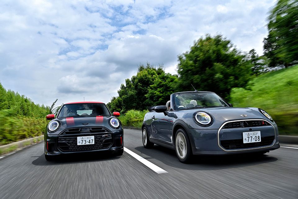 昨年、10年ぶりのフルモデルチェンジを経て登場した第4世代の新型「ミニ・クーパー」。フル電動モデルをラインナップしたことも大きな話題だった。今回は、3本立てのモデル構成の頂点に立つ「JCW」とコンバーチブルが上陸したとの知らせを受け、3ドアのJCWとコンバーチブルのクーパーSを借り出した。どちらも内燃機関モデルの2台だ。