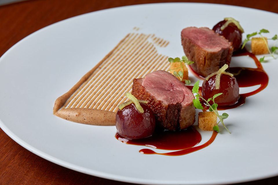 「青森県産津軽かものロティ ブドウのガストリックとパンデピスの香り」。ランチ(10時~15時LO)・ディナー(17時半~21時半LO)共通の6600円以上のプリフィクスコースのメインディッシュ。ディナータイムはアラカルト(3000円)でも。