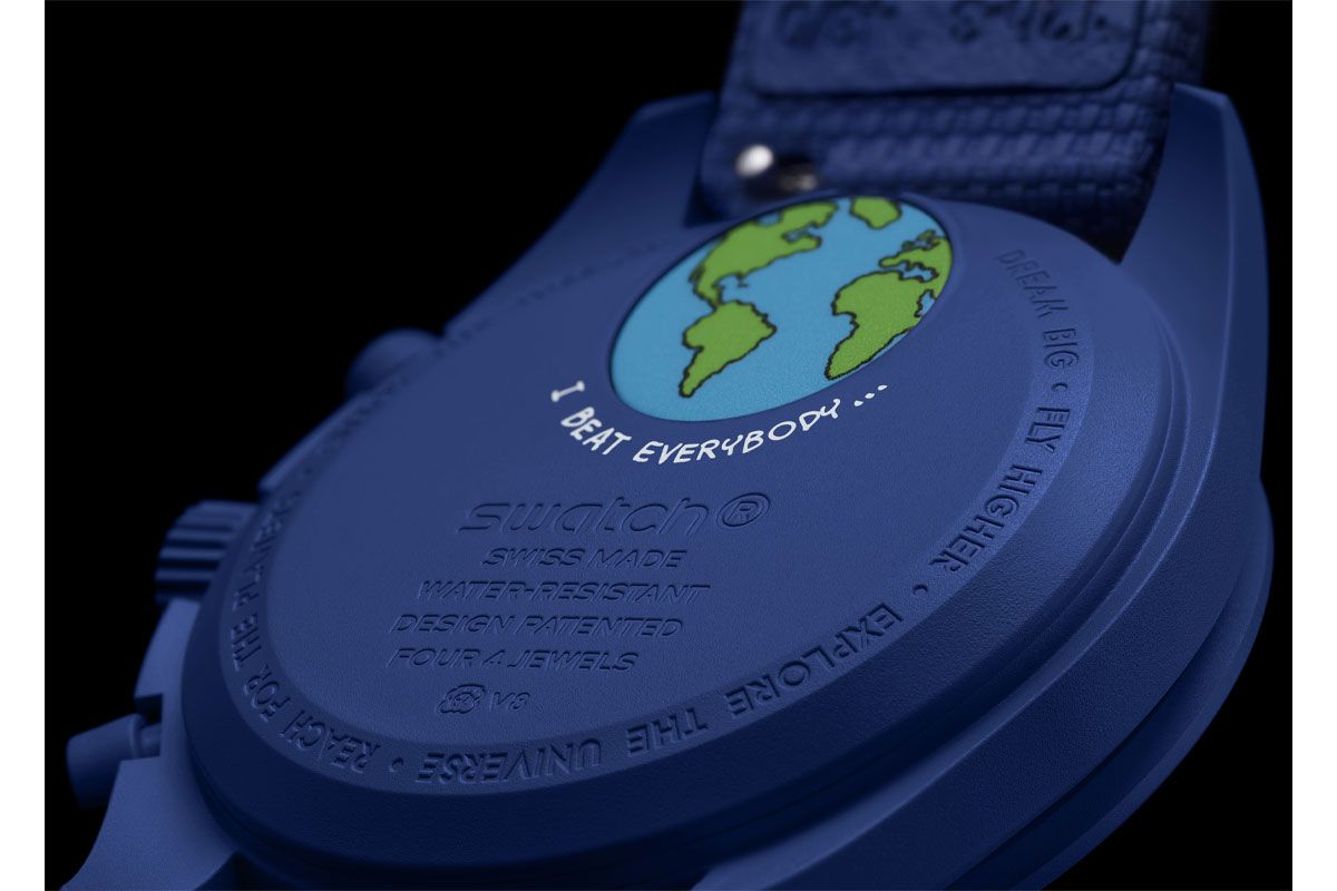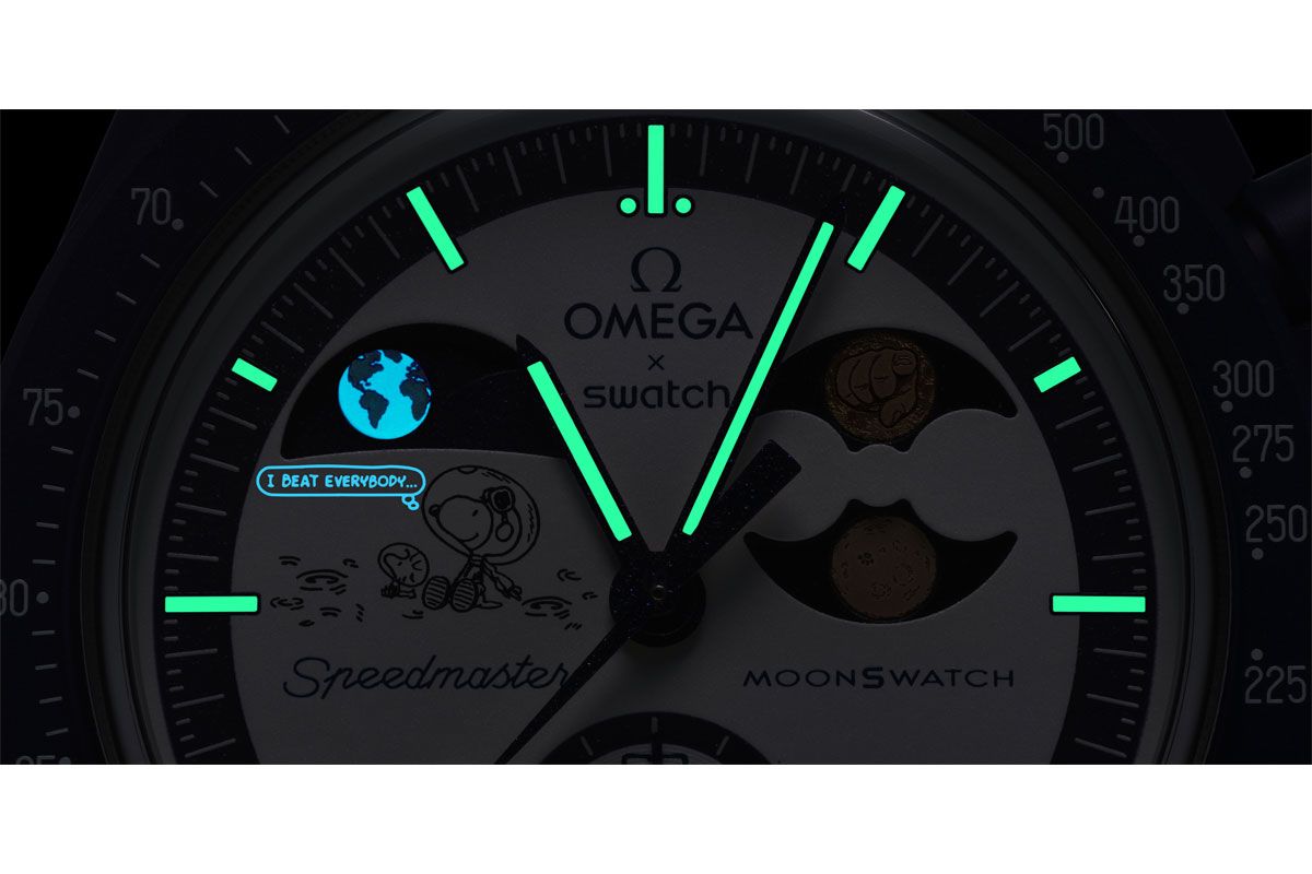 ホワイトオパーリン文字盤のイラスト=スヌーピーがウッドストックと共に月面に座り、美しい惑星である地球の魅惑的な光景に感嘆している様子は前作と共通だ。暗い場所でこのイラストにUVライトが当たると「I BEAT EVERYBODY」(ついにやったぞ)の文字と、地球のシルエットが浮かび上がる。