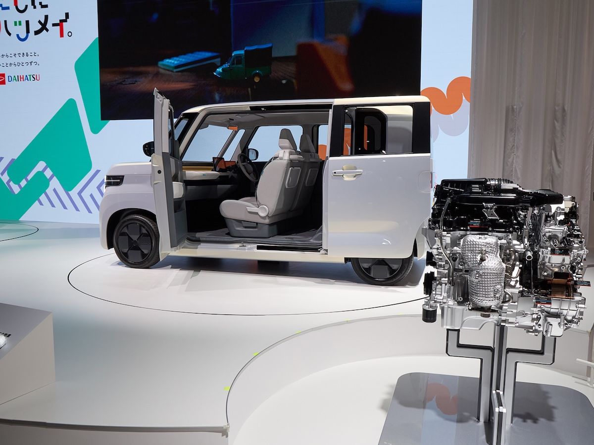 なんと後輪駆動になるという次期型コペンや、愛らしい「ミゼットX」、AI搭載というトヨタのKAYOIBAKO(カヨイバコ)シリーズに加わった「KAYOIBAKO-K」などのコンセプト群に目が行きがちのジャパン・モビリティ・ショー(以下JMS)2025のダイハツ・ブース。確かにどれもこれも気になる存在だけど、そのいっぽう詳しい解説もなく、しれっと飾られていた一基のパワーユニットと、それを搭載するであろう一台も、見た目が華やかなスタリング重視のコンセプトだらけだったJMS会場内において、地味だけど近未来の自分たちの生活に密着した、とても注目すべき存在だった。