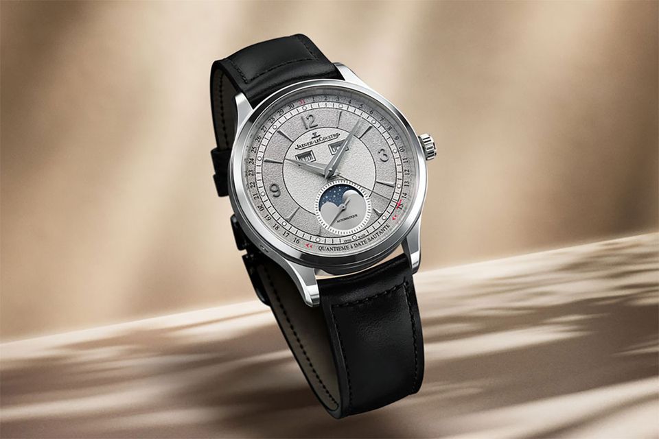 ジャガー・ルクルトのマスター・コントロール・カレンダーは、ツートーンに彩られた新しいグレイン(自然な凹凸)仕上げダイアルが特徴の限定モデル。ライトグレーとダークグレーを交互に用いて各表示を明確に区切り、クラシカルなレイアウトを美しく視認性の高い意匠へと昇華している。