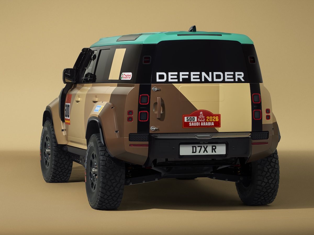 ボディ・シェルは「ディフェンダー110」のものだが、燃料タンクは550リットルの専用品を車体後部に搭載し、800km以上の行程に備える。車内には、競技仕様のロールケージも組まれた。ボディ・ワークは前後が変更され、対地障害角を改善。路面とのクリアランスも拡大された。ルーフには、ライト・ポッドとキャビンへの通気口が設けられている。