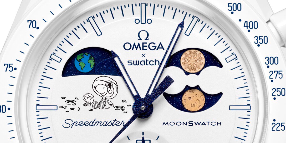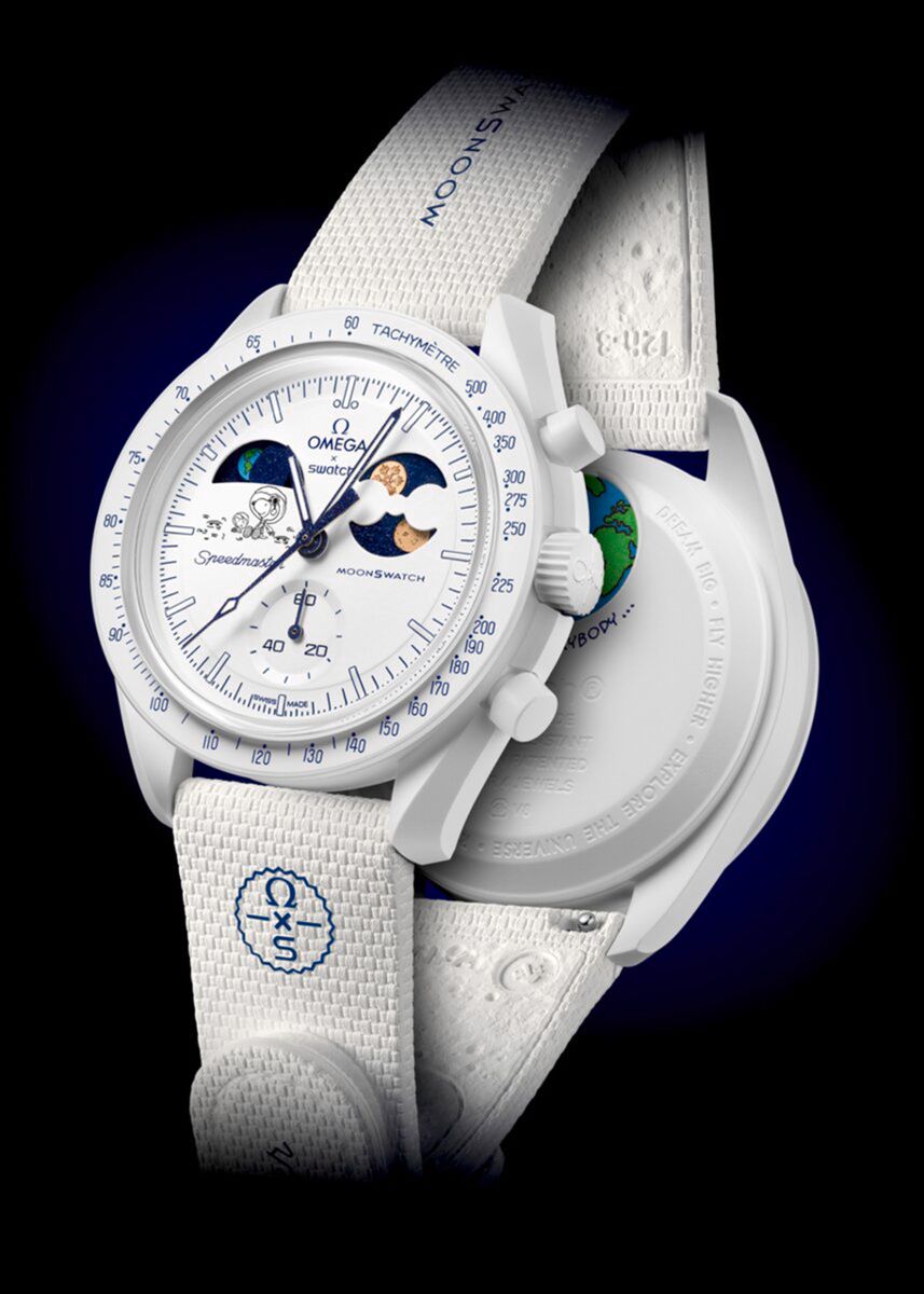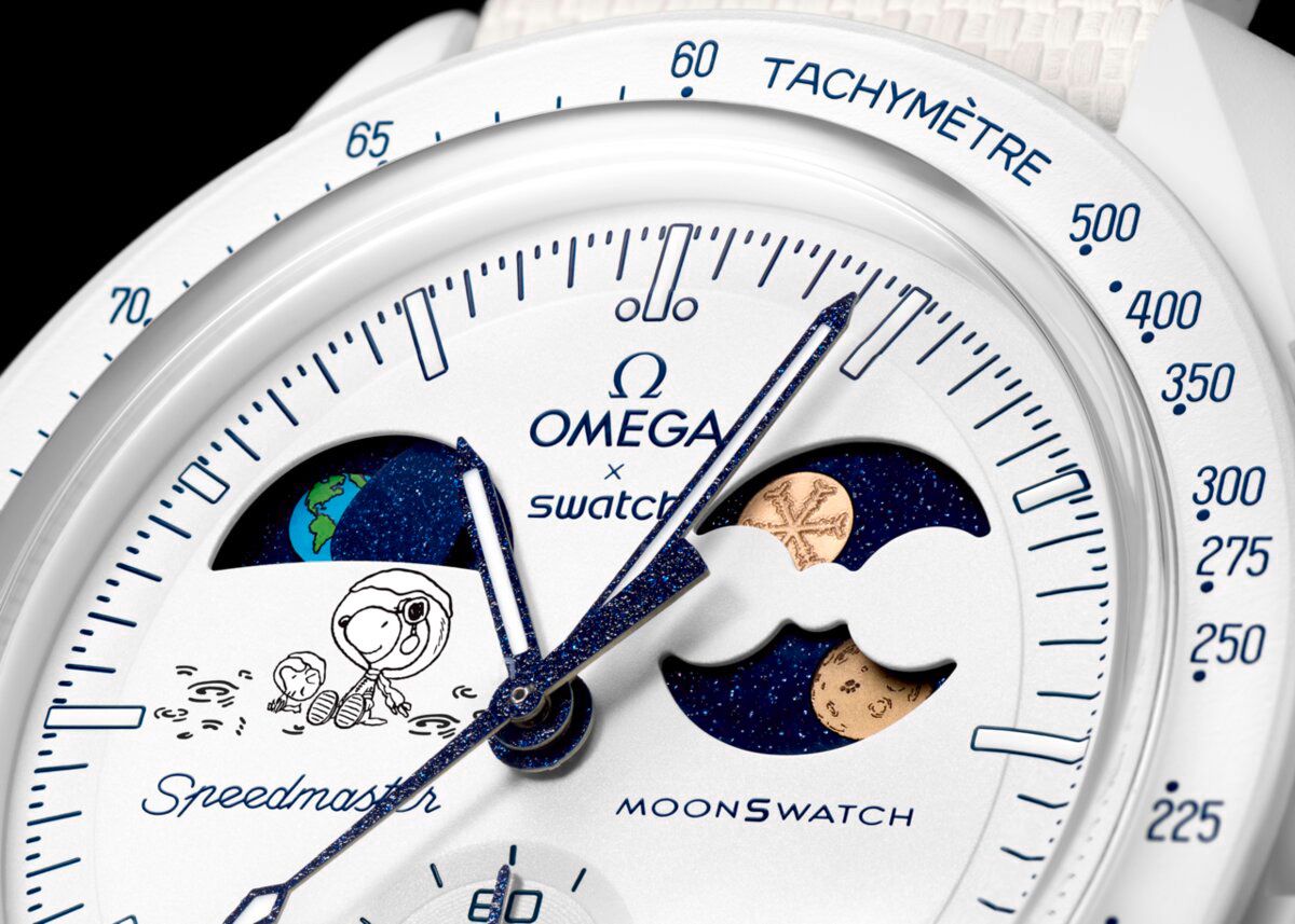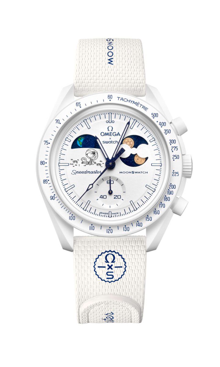 雪に覆われた冬景色を想わせるホワイトの色合いで作られたこの新作は、アースフェイズやオメガのムーンシャインゴールドを使ったムーンフェイズなど、これまでのムーンスウォッチと同様の文字盤のレイアウトを継承。もちろん、9時位置にはスヌーピーのイラストが配置されている。