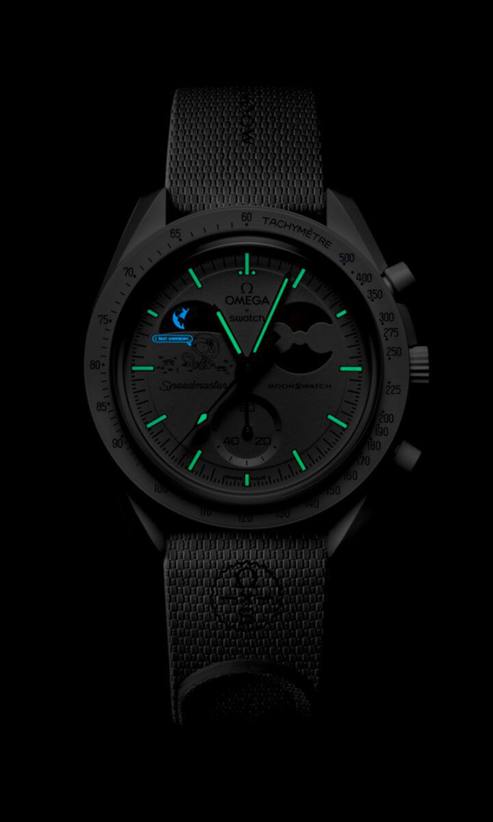 ・文字盤:ホワイトオパーリン、OMEGA × SwatchとSpeedmasterとMoonSwatchのロゴ付き。Grade A Super-LumiNova(グリーンの発光)を施したサブダイヤルとアワーマーカー。OMEGAのMoonshine Goldでコーティングされた2つの満月が特徴のダークブルーのムーンフェイズディスクを備えたムーンフェイズ表示。UVインク(ブルーの発光)のディテール。星空を背景にした地球とUVインク(ブルーの発光)でコーティングされた海が特徴のアースフェイズ表示。