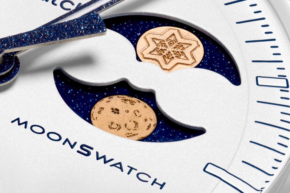 冬のシーズン(2025年12月5日〜2026年3月20日)のみ販売され、発売日以降(12月6日〜)はスイスで雪が降る日だけ手に入れることができる新作ムーンスウォッチのムーンフェイズには、ユニークな雪の結晶がデザインされている。