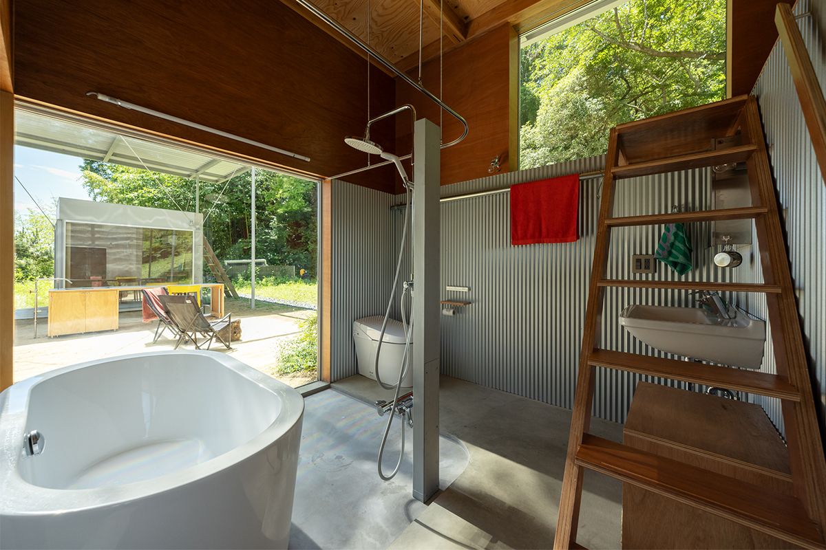どこまでが家でどこからが屋外なのか、庭で暮らすような家。敷地はおよそ2000平方メートルで、半分は雑木林。面積にして約220平方メートルもあるガルバリウムの大屋根の下に、庭を囲んで小さな建物が3棟。それぞれが母屋、バスルーム+収納、アトリエで、床面積の合計は60平方メートルほどしかない。湯船に浸かると、上の窓の向こうに、林のご神木的存在である桜の大木が見える設計。お風呂・トイレは、カーテンで仕切れるようになっている。階段の上は収納。