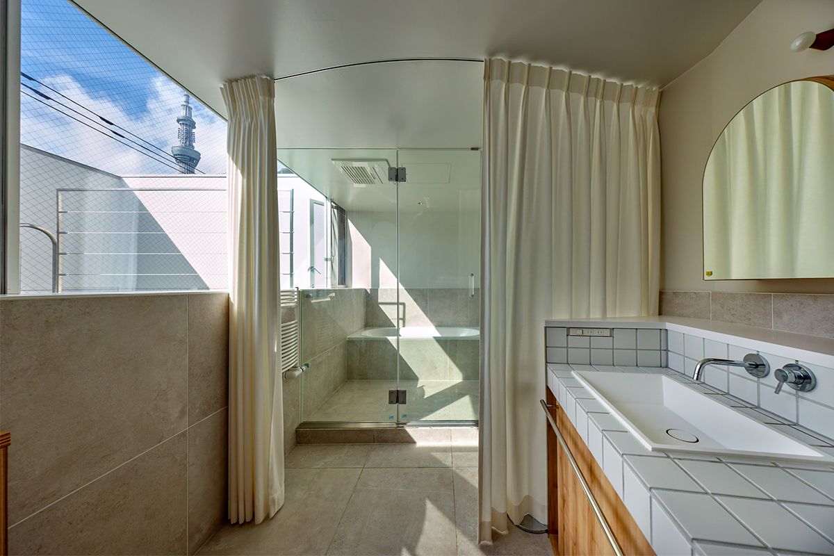 バスルームがあるのは、2.5階相当の最上階。そこからスカイツリーも見える、風呂好き家族の下町の家。すぐ横に、隣家が迫っているとは思えない開放感。バスルームのガラス窓の向こうには屋上テラスが見え、広さを感じさせる工夫も。