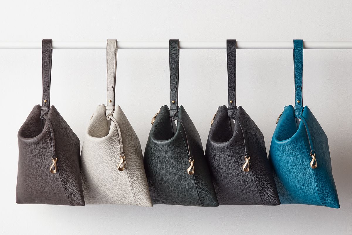 サイズは縦29×横20×マチ24.5cm。(写真左より)アンバーブラウン、ライトグレー、ブリティッシュ・グリーン、ブラック、ターコイズブルーの全5色あり。各3万6300円。