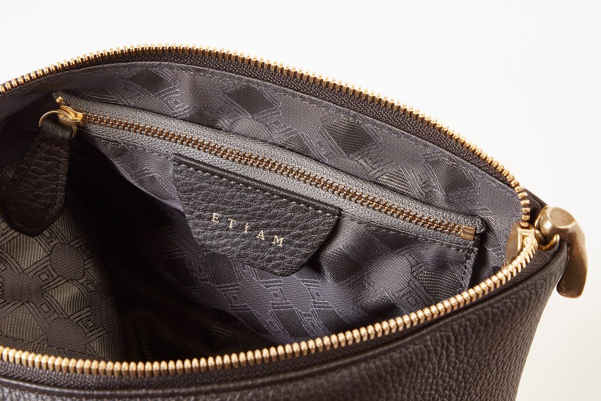 旅先ではどうしても、折りたたみタイプのナイロン製バッグをサブバッグとして選びがちだが、このポーチはエティアムの十八番であるシボ感が美しいシュリンクレザーなので、旅先のコーディネートもエレガントかつラグジュアリーにまとまる。