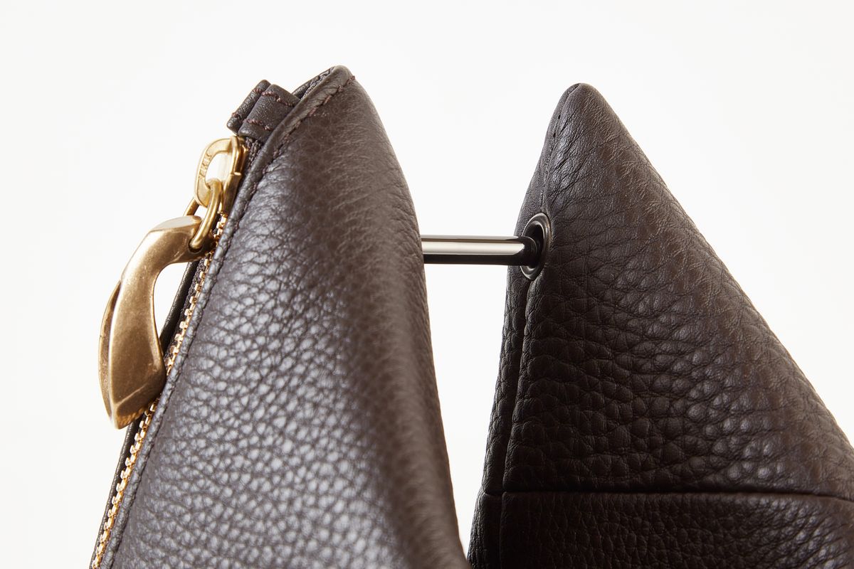 光を分散・屈折させて生まれる多彩な色を放つ光線〝プリズム"のように、何気ない日常に鮮やかな色彩の輝きを添えてくれる、ユニセックスなデザインのトライアングル型ポーチ。ボディとストラップの接続用に開発したオリジナル金具により、たわみが美しい巾着のような上部のシルエットが特徴だ。