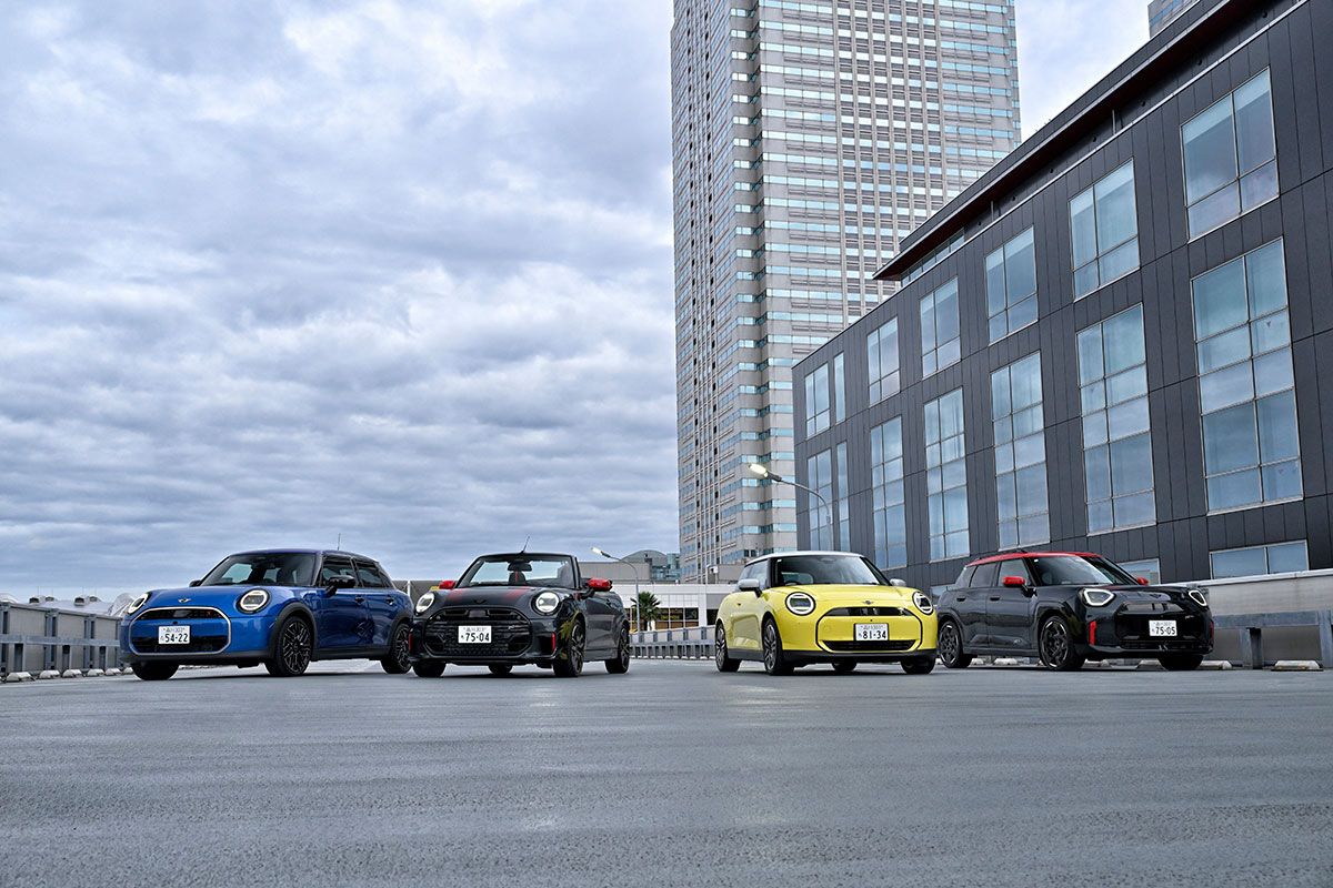 試乗したBEVのJCWエースマン、クーパーSE、ガソリン車のJCWコンバーチブル、クーパー5ドアSの4台