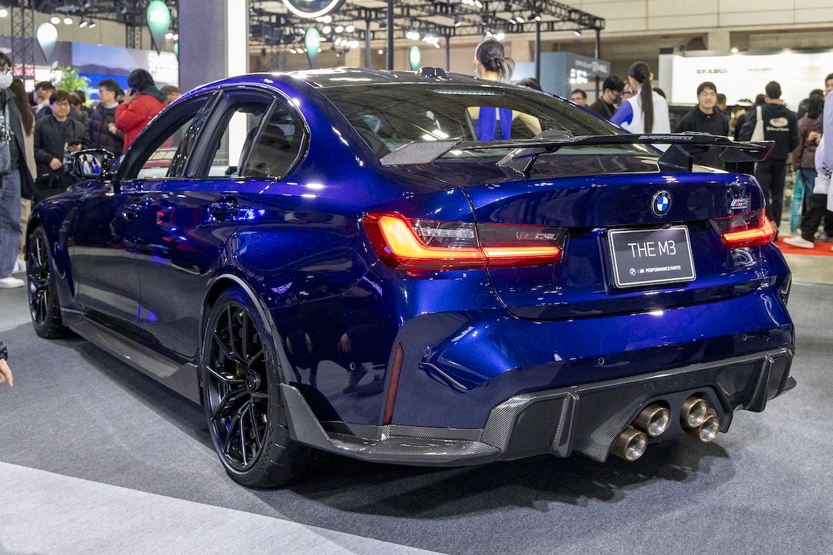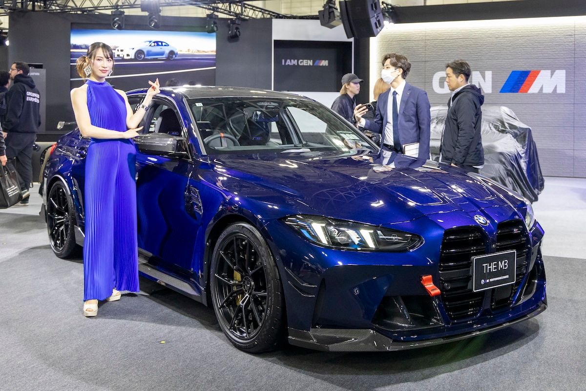 筆者のイチオシはBMWブースの入口で出迎えてくれるM3。ボディ下端には全周を囲うようにカーボン製のスポイラーが備わる。リアに奢られた4本出しマフラーは、M2 CSの展示車同様に存在感バツグンだ。スワンネック形状のリア・ウイングは、見ているだけでクルマ好きの心がくすぐられる。