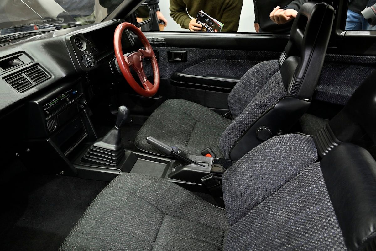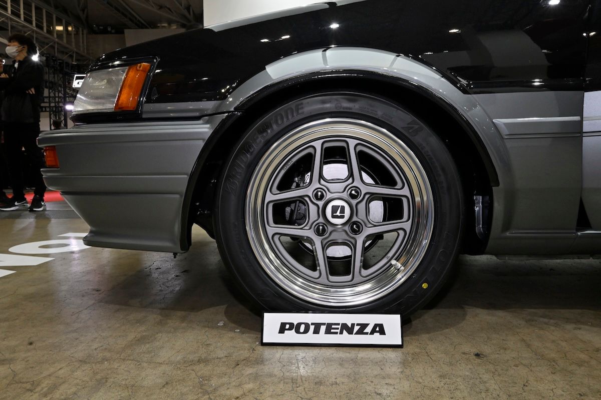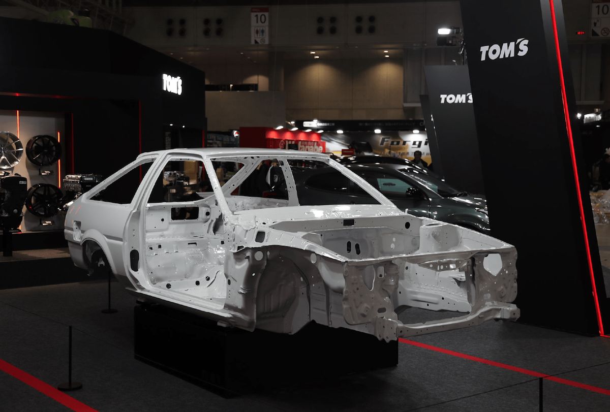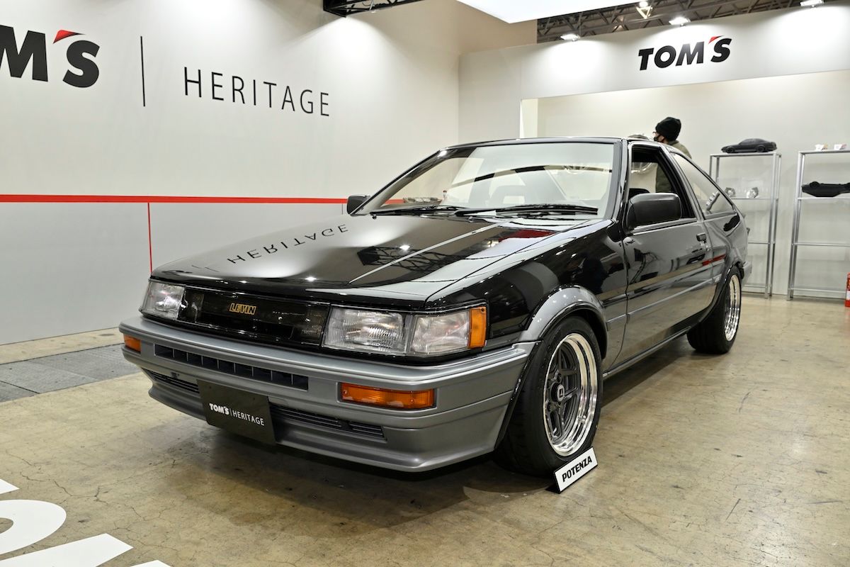 展示車両は、新車と見紛うばかりに仕上げられたAE86型カローラ・レビン。レストア車としての完成度もみごとだが、シャシーはスポット増しなどの補強も実施し、レースカーのノウハウを注入したアンダーパネルなどを装備した。