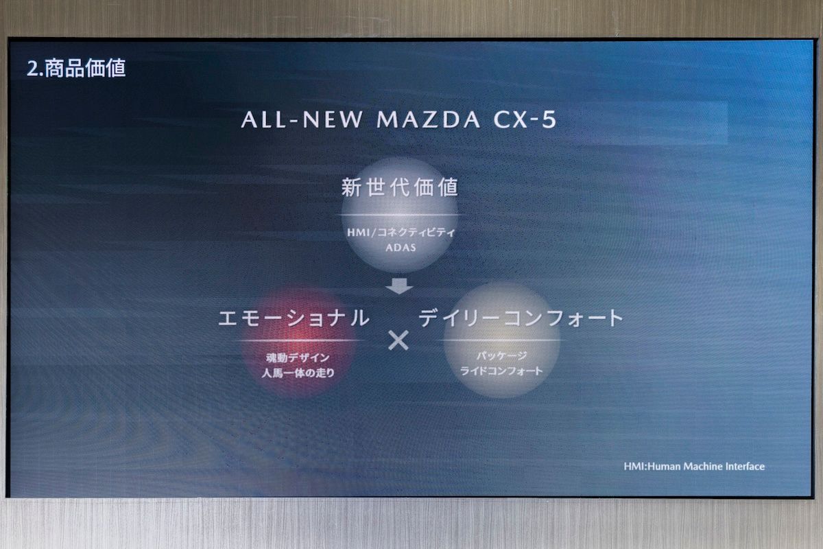 新型CX-5の開発コンセプトは「新世代価値」、「エモーショナル」、「デイリー・コンフォート」の3本柱なのだという。