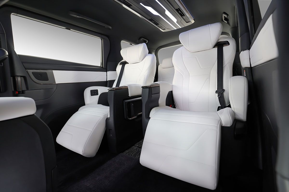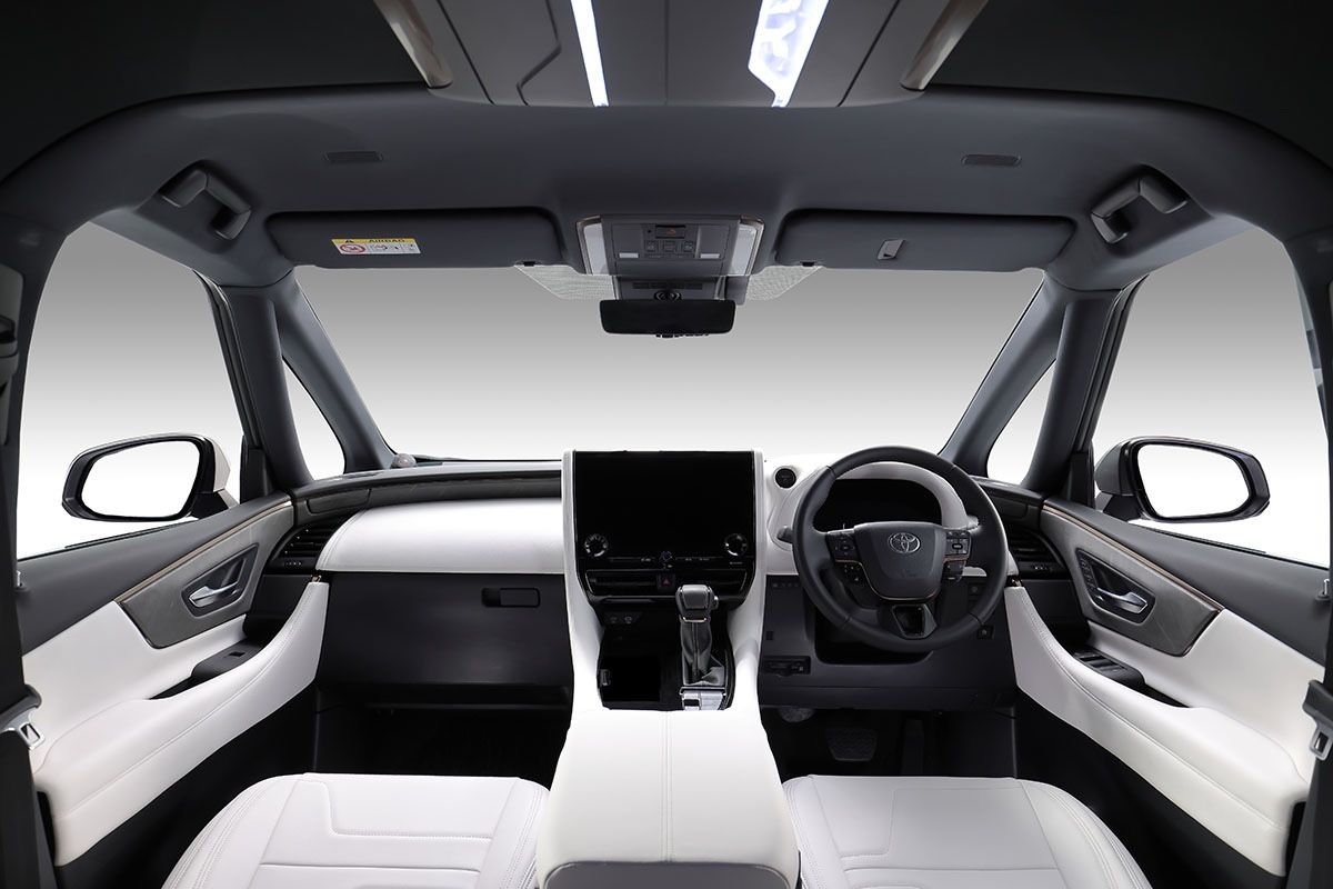 インテリアは、ホワイト・レザーを中心に天然石のオーナメントを組み合わせ、上質感や新しさを提案。オーバーヘッド・コンソールには、外装にも見られたような幾何学的イルミネーションを装備した。