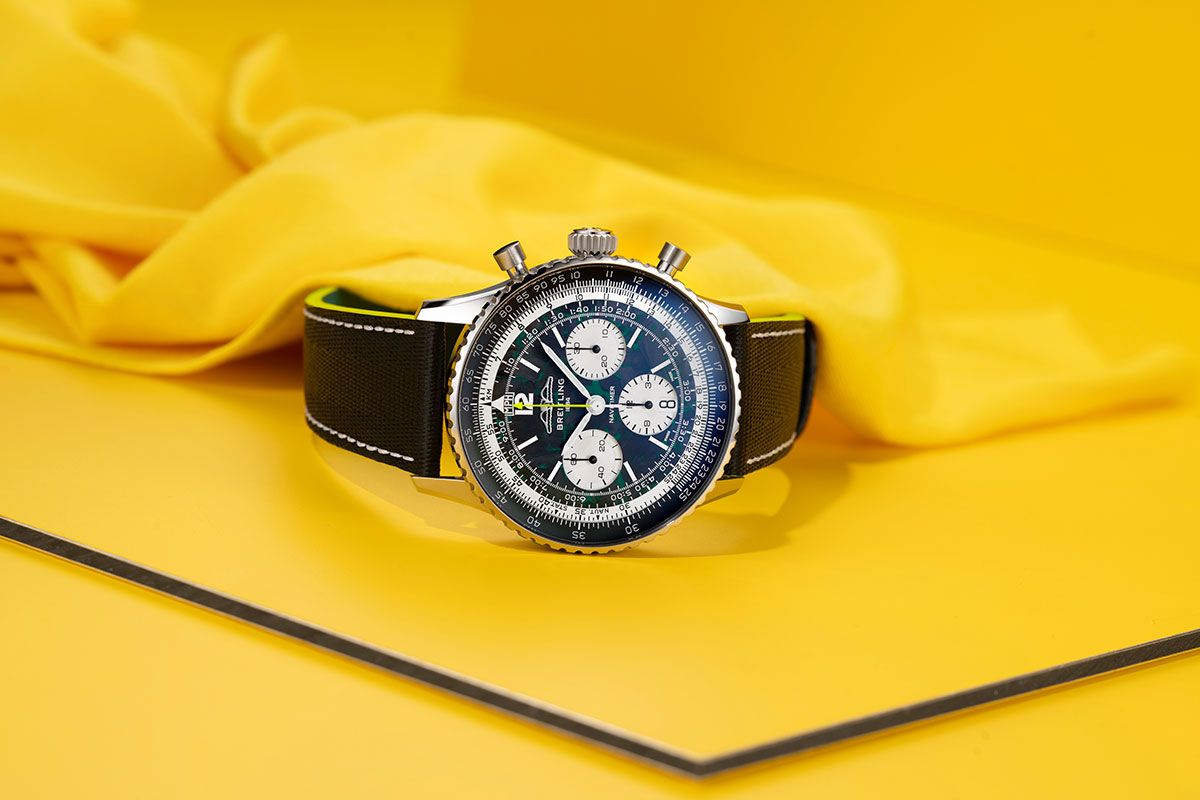 アストンマーティン・レーシンググリーンとライムのアクセント、ナビタイマーで初めて採用された軽量チタンケース、F1(R)マシンのコクピット素材に着想を得たカーボンファイバー文字盤など、さまざまな要素がハイパフォーマンスを体現する。