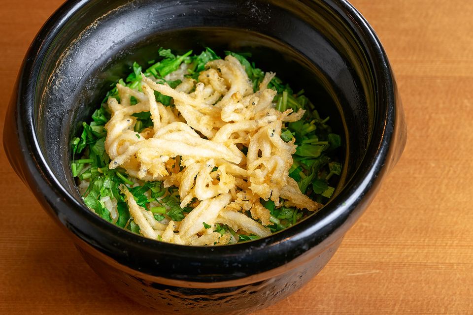 料理は10品3万250円のコースより。出汁で炊いた土鍋ご飯の上に、香ばしく揚げた白魚の天ぷらと三つ葉を乗せた「白魚の天ぷらご飯」(2人分)。お代わりの際は熱い出汁と海苔をかけて、出汁茶漬けのように提供される。天ぷらの素材は季節によって替わる。