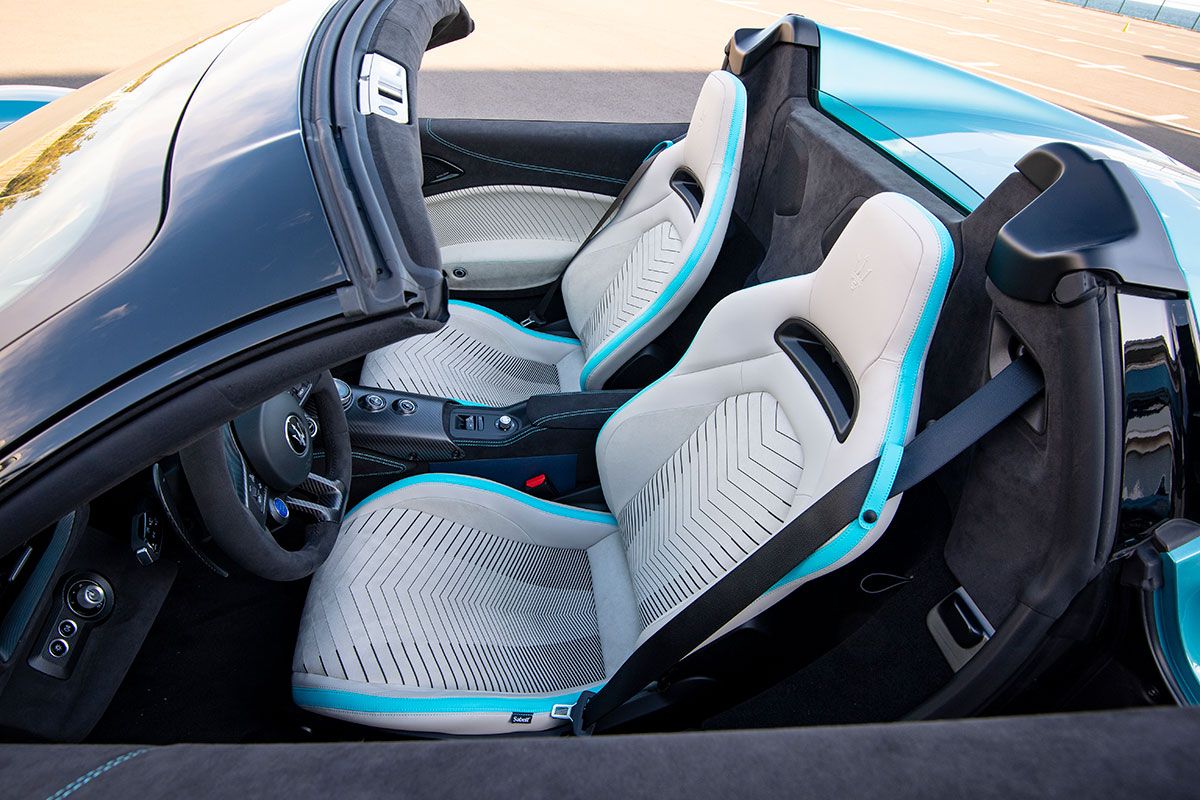 アグレッシブな2シーター・スーパースポーツそのもののエクステリアはAIアクアレインボーと呼ばれるカラーリングに包まれる。見た目はブルーなのに陽光の角度によっては虹が現れる不思議なペイント。さらに大きく跳ね上がるバタフライドアを開けて現れたのがアイスカラーのアルカンターラで仕上げられたスポーツバケットシート。インテリアのすべての仕上がりも目を見はるような高質感。