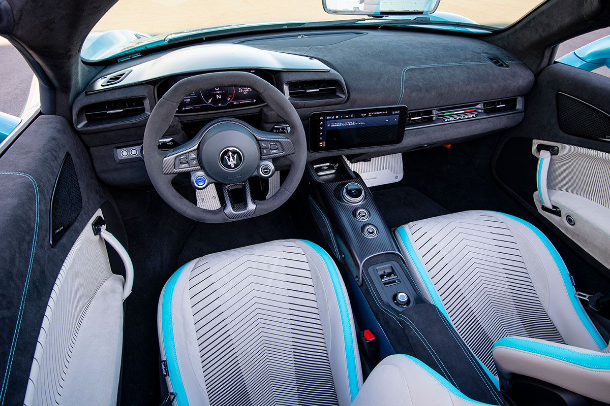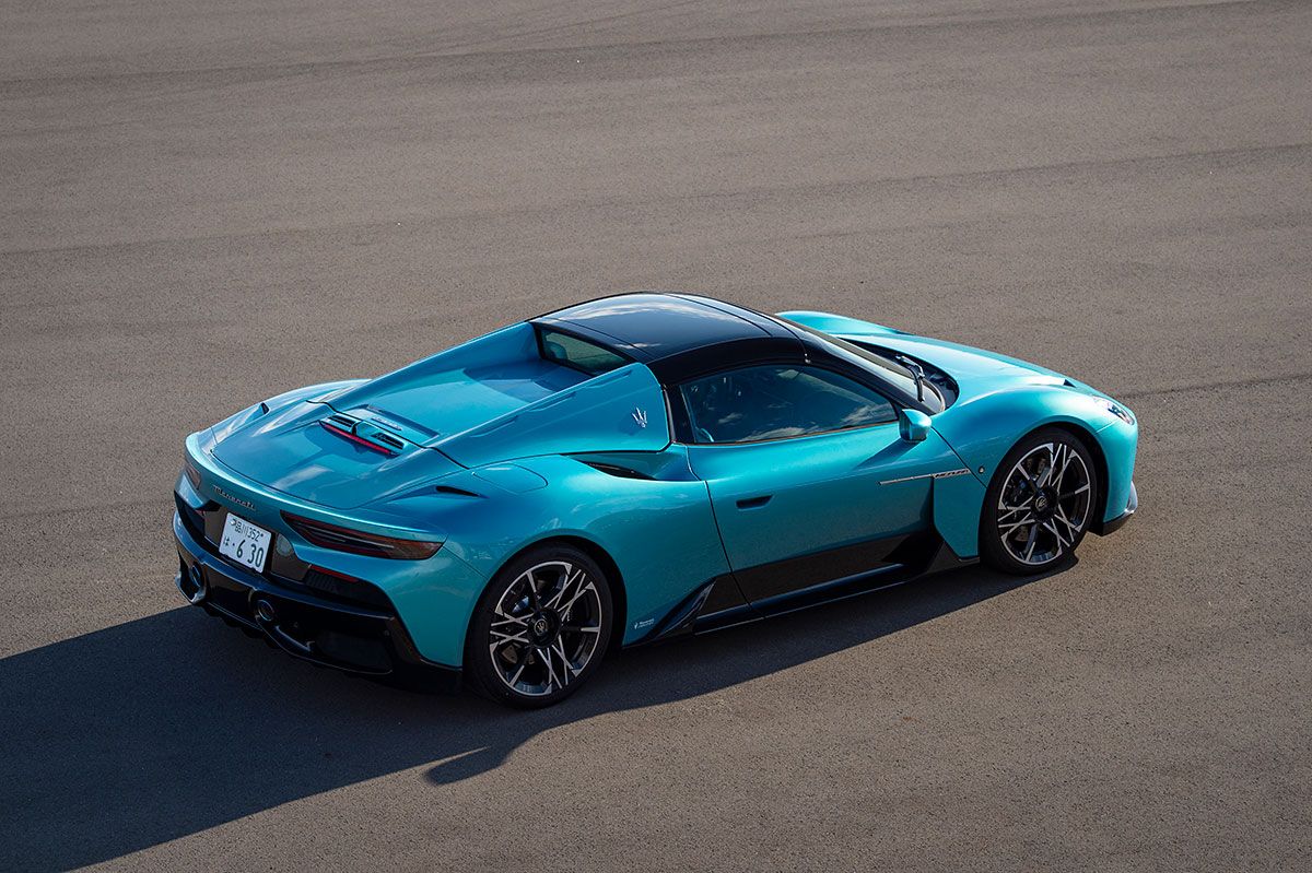 ■マセラティMCプーラMC12以来、16年ぶりのミドシップ・スポーツであるMC20の進化版。MC20同様、クーペのほかに今回試乗した開閉式ハードトップのチェロを設定する。副燃焼室付き3.0リッター V6ツインターボを搭載。全長×全幅×全高=4669×1965×1224mm。ホイールベース=2700mm。車両重量=1560kg。車両価格=3545万円。