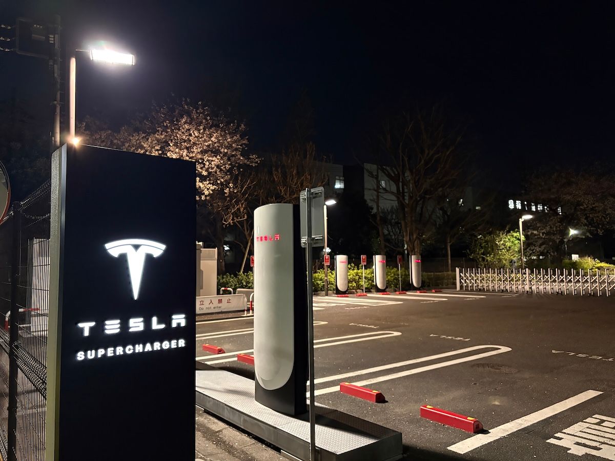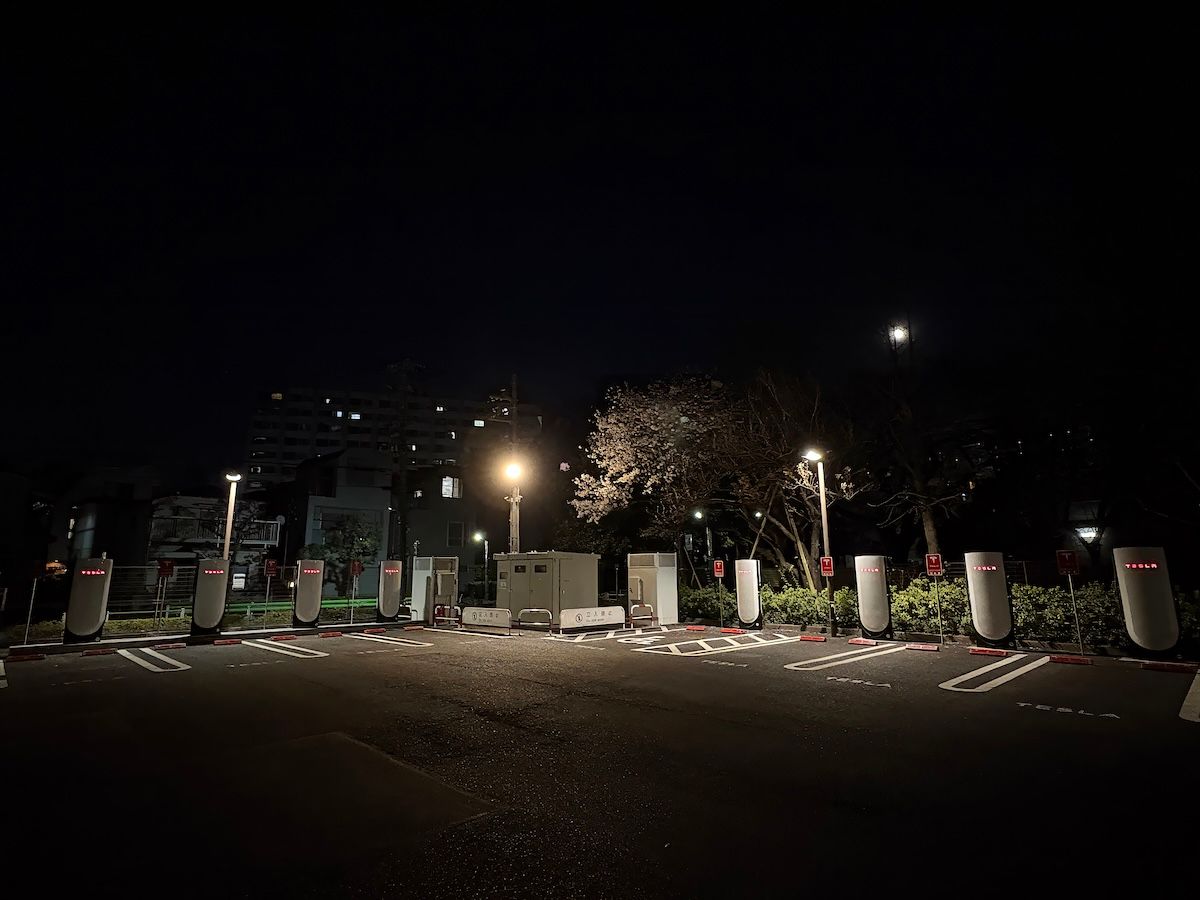 うれしくて夜桜を撮りに河川敷を走っていたら、白い筒状の充電器と、そこに描かれた真っ赤な色の「TESLA」というロゴでお馴染みの、テスラ社のスーパーチャージャーを見つけた。暗がりに怪しく赤く光る充電器の台数は8基。たまたまいたモデルYのオーナーに聞けば、1年ほど前に開設し、ほぼほぼ空いているという。うわ、完全にノーマークだった。