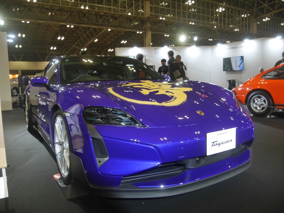 新型ターボSと並んで展示されたのがポルシェのBEVスポーツセダンであるタイカン・ターボGT。そのボンネットには、金色で「夢」の字が描かれている。これは書家でアーティストの岡西佑奈氏の筆だ。これはポルシェ・エクスペリエンスセンター東京の開設4周年イベントでのライブパフォーマンスで完成したものである。