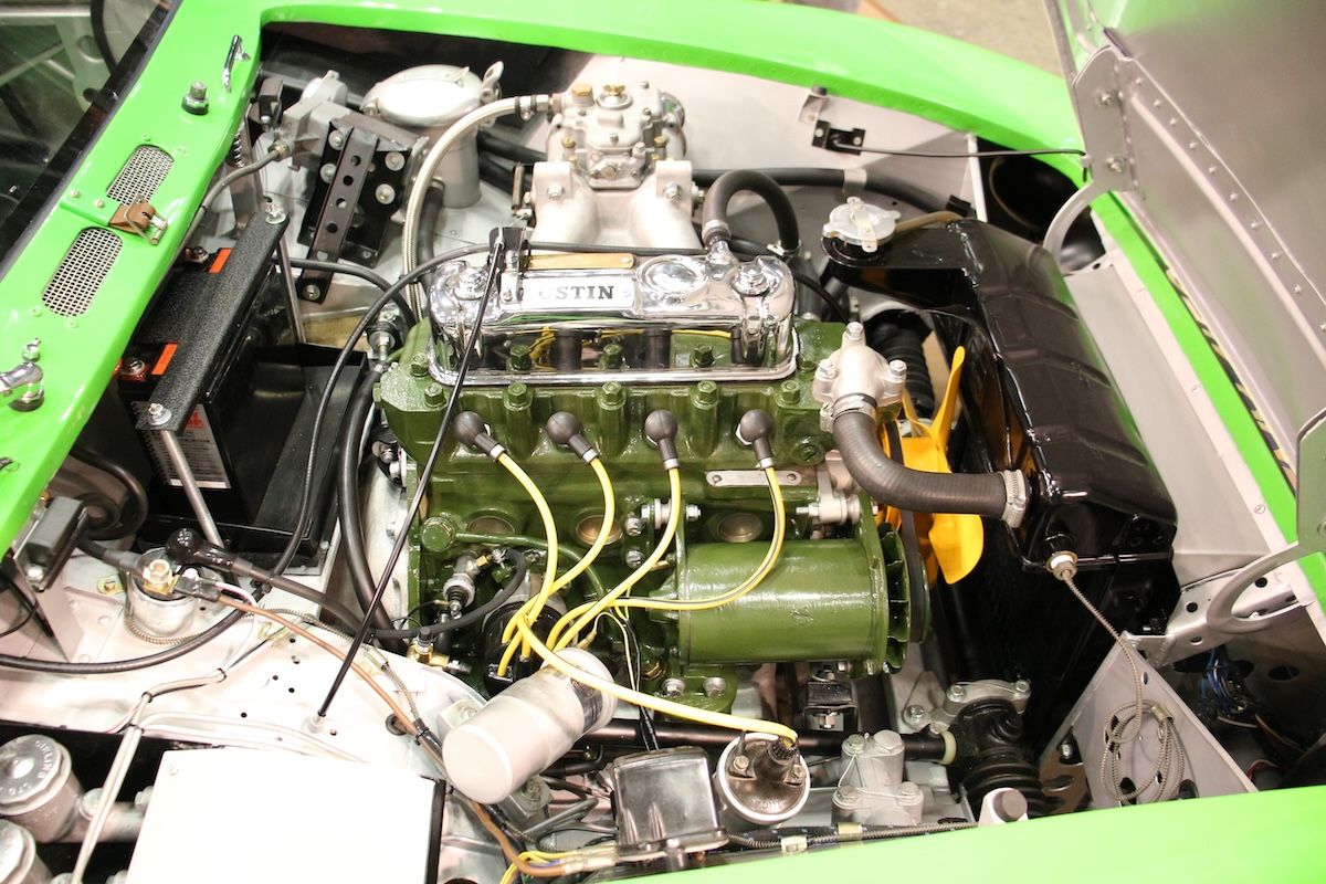 ゼッケン#49号車に積まれているBMCコンペティション・ドライサンプ・エンジンはビッグバルブで、ヒーター・バルブが埋められている仕様となる。XSP専用のAEG305と呼ばれるAシリーズ・エンジン用スペシャル・シリンダーヘッドを採用している点も特筆すべきポイントだ。トランスミッションはMG B用のケースを使い、中身はヒーレー・ワークス謹製となっている。