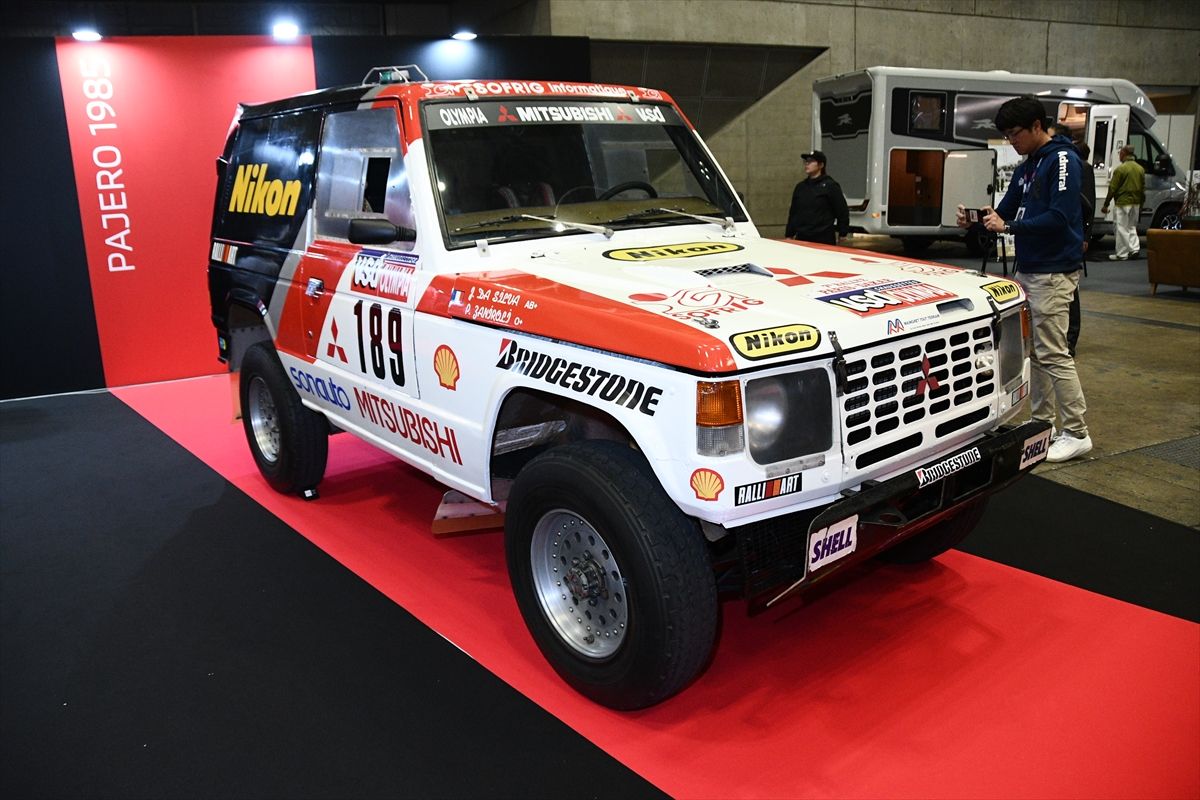 パジェロといえばダカールラリーというイメージを強く持っている方も多いだろう。パジェロが初めてダカールラリーにチャレンジしたのは初代モデルが登場した翌年である1983年のこと。当時はパリをスタートしてダカールでゴールするまさに「パリダカ」であった。1983年の参戦クラスは市販車無改造クラスで初参戦し初優勝した。翌1984年は市販車改造クラスで参戦しクラス優勝。総合でも3位となっている。そして参戦3年目となる1985年はプロトタイプクラスで参戦し、総合優勝を果たした。展示していた1985年の優勝車はその40周年となる2025年に走行可能な状態までレストアされた。