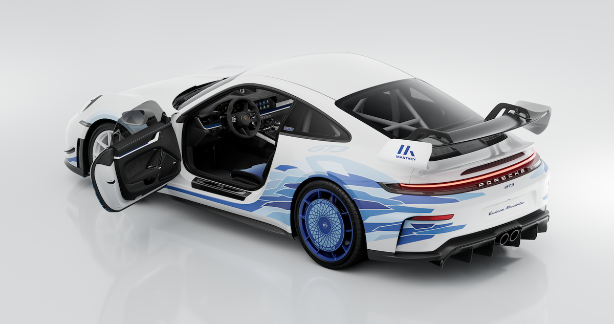 ベースとなるのは、992後期型の911GT3。パワーユニットは同様の4L自然吸気フラット6が搭載され、510psを発揮する。これに純正チューニングパッケージのマンタイキットが装着されることで、高速域での安定性とサーキット性能を一段と引き上げた仕様となっている。つまり、見た目だけの特別仕様ではなく、あくまでも走りの純度を担保した前提で成立しているモデルなのだ。